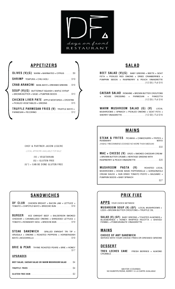 Days on Front offers contemporary Canadian Cuisine, reflective of a simplified, yet refined approach to taste. We are proud to offer the finest ingredients, sourced locally whenever possible.